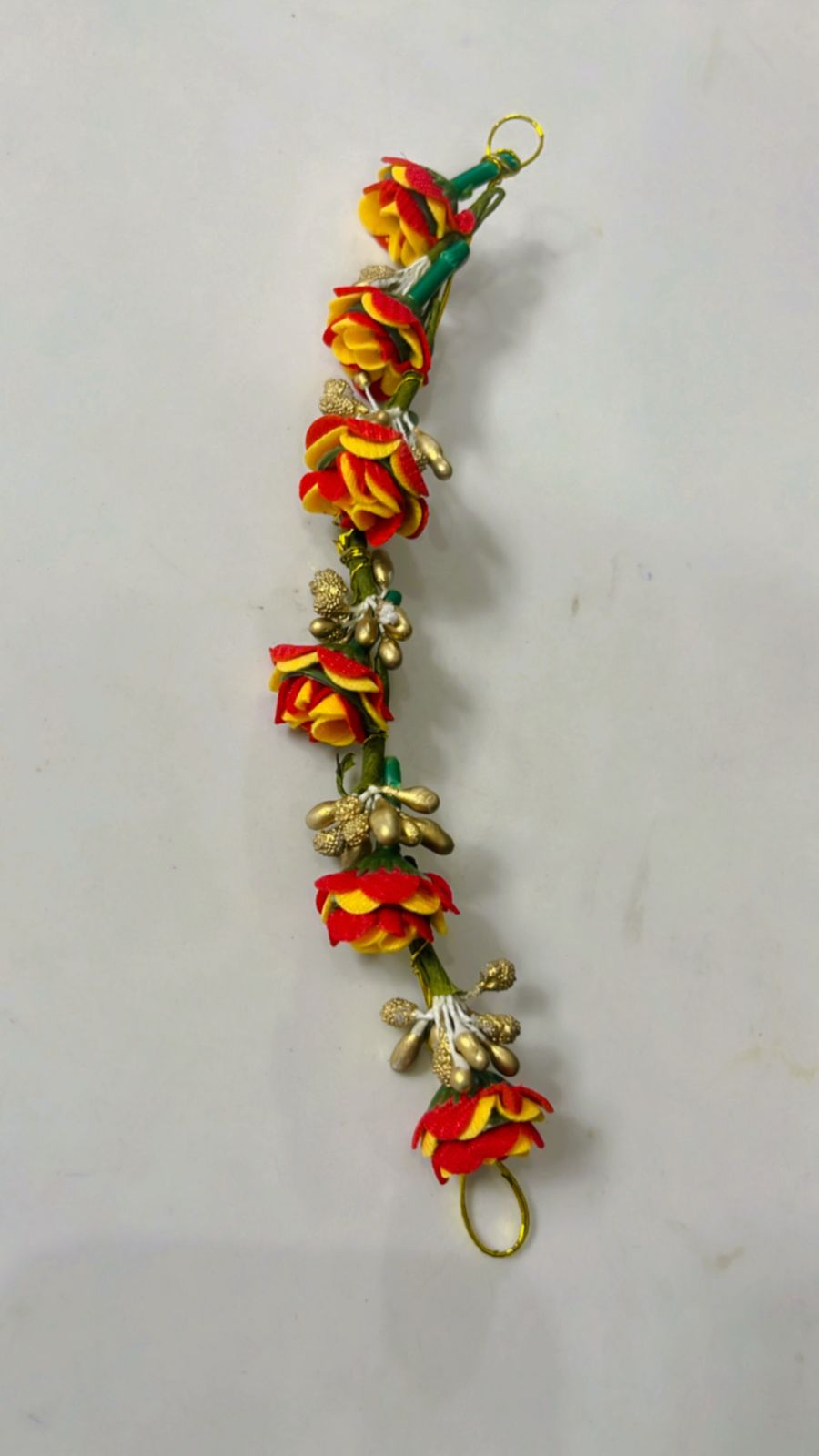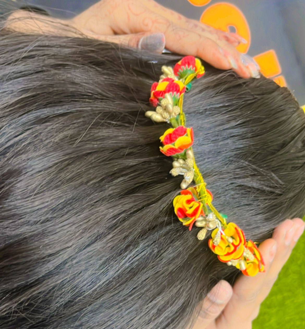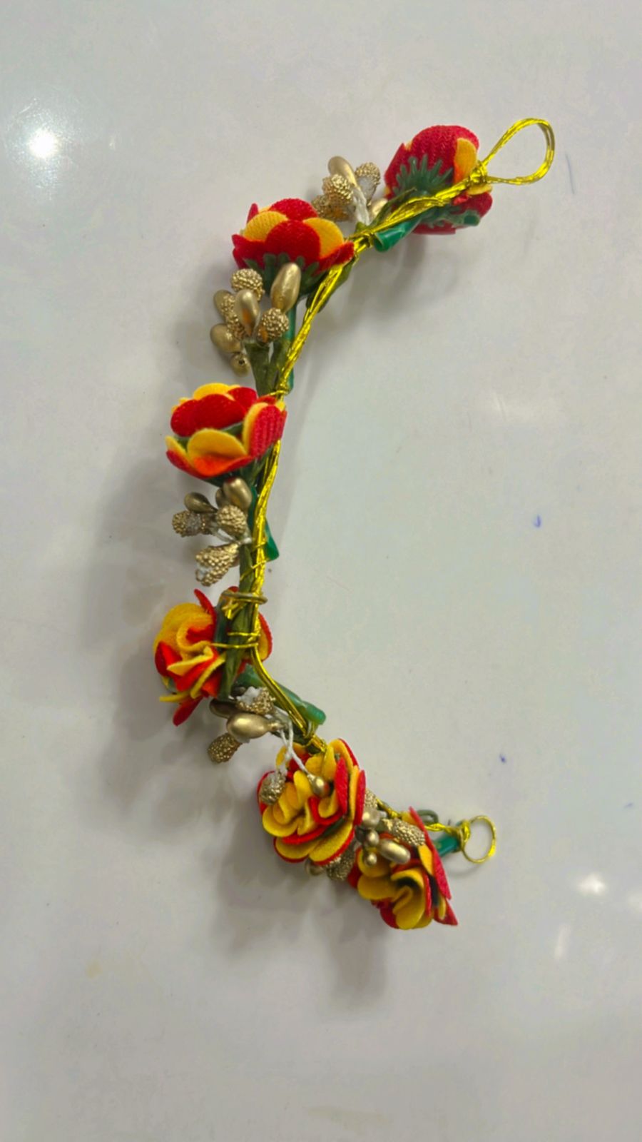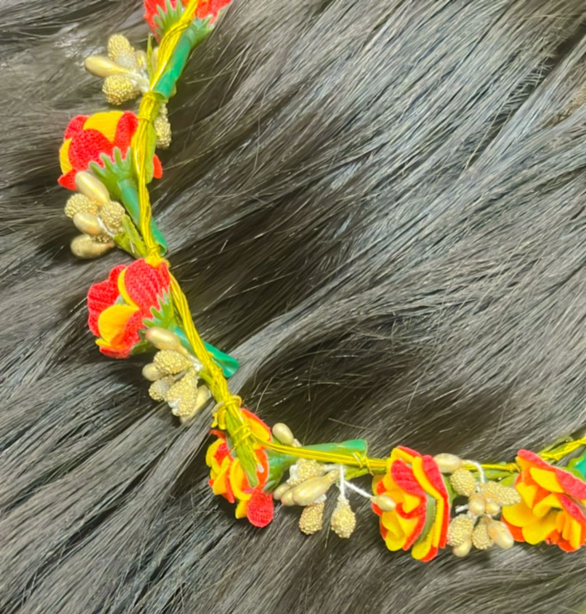 This beautiful handcrafted floral hair accessory is the perfect pick for festive occasions and traditional functions. Made with soft artificial flowers in eye-catching red and yellow tones, it is accented with golden buds and wrapped in decorative thread for a neat and stunning look.