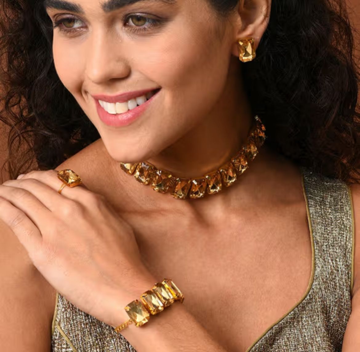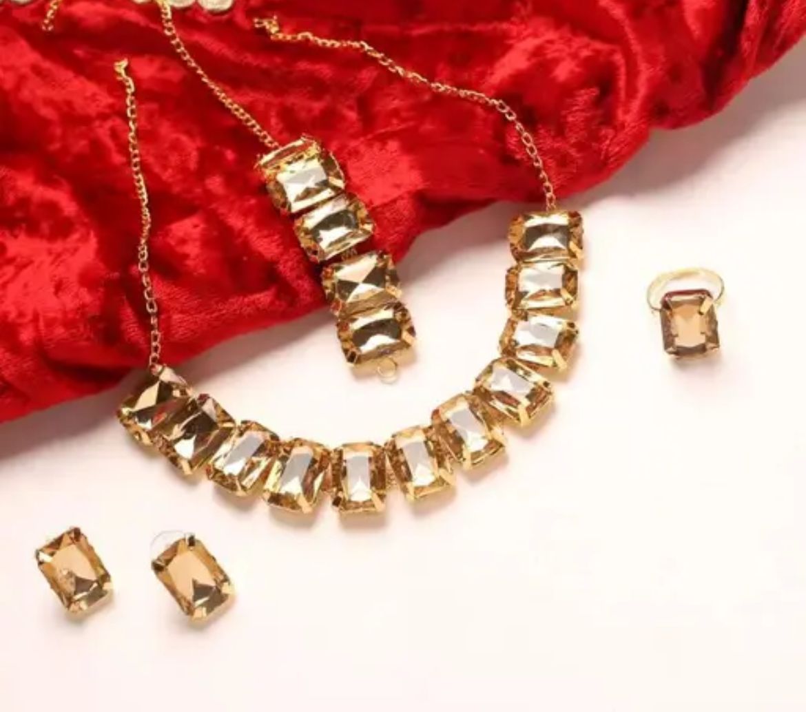 Beautiful Shimmering Korean Crystal Necklace Set With Earings Bracelets And Finger Rings For Women Golden SR_547