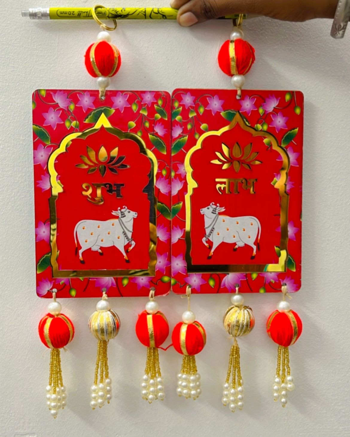 Wooden Shubh Labh Pichwai Cow Hanging for Main Door Entrance, Diwali Puja, Pooja Room, Home Temple, Mandir – Handmade Festive Decor Item 1 pair SR_852741